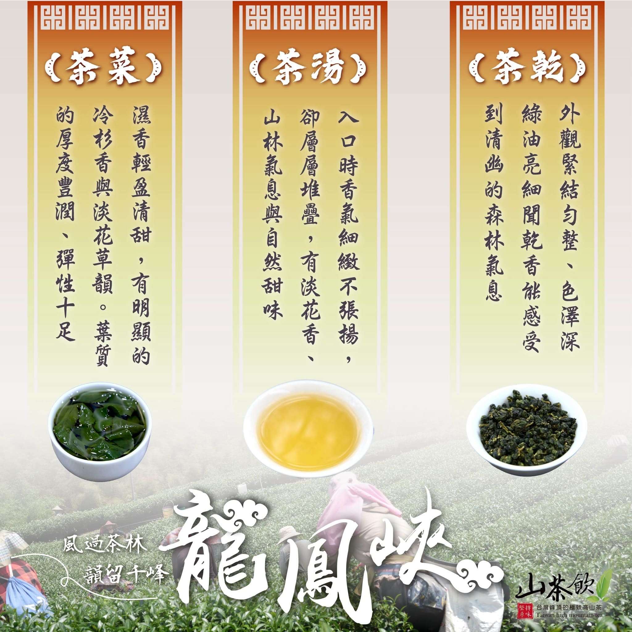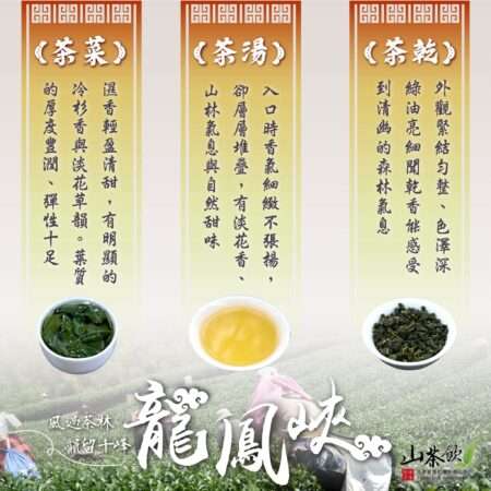 口感:湯色蜜綠透黃,甘甜滑順獨特花香